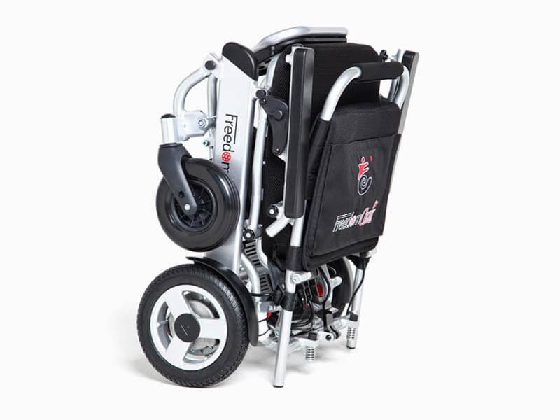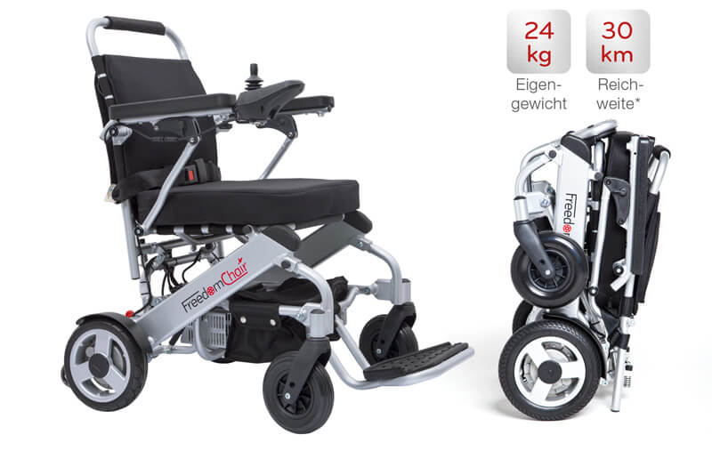 Das Modell A06 aus der FreedomChair Serie der faltbaren elektrischen Rollstühle ist mit 59 cm Gesamtbreite etwas schmaler und passt damit auch noch durch einen 60 chm Türstock. Mit nur 24 kg Eigengewicht und den kleinen Rädern ist der FreedomChait A06 sehr wendig. So bewegen Sie sich nicht nur unbeschwert durch die eigenen vier Wände, sonder auch flott durch die Stadt. Er hat Platz für 2 Batterien und kann somit eine Reichweite von bis zu 30 km erreichen. Vorder- und Hinterrräder sind mit PU-Reifen ausgestattet. Der FreedomChair A06 ist für Personen bis 110 kg geeignet. Zudem ist dieser Elektrorollstuhl ebenso faltbar und passt in jedes Auto.