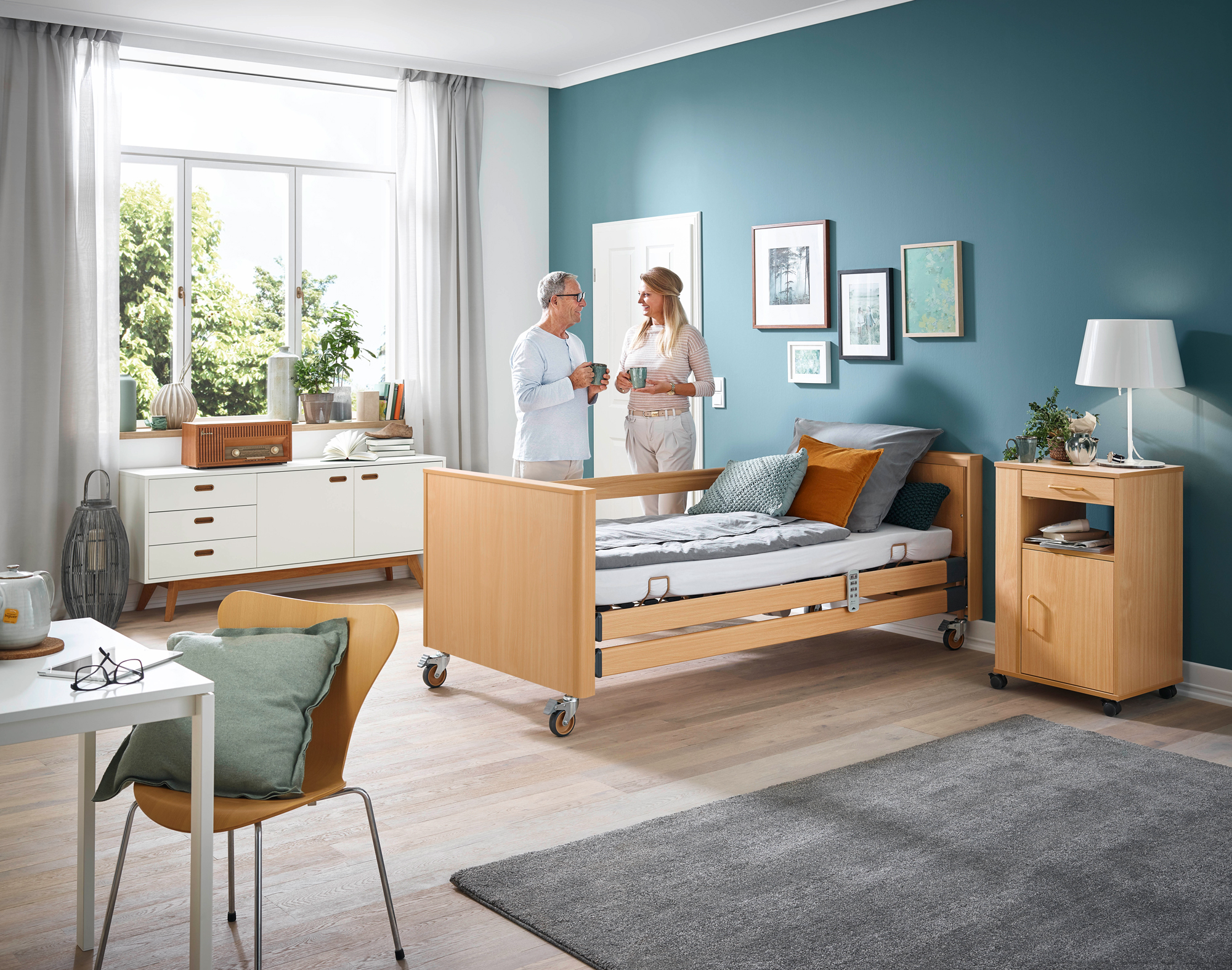 Mit den optionalen Holzhauben für Kopf- und Fußteil sieht das Pflegebett Serie "Dali" noch wohnlicher aus.
