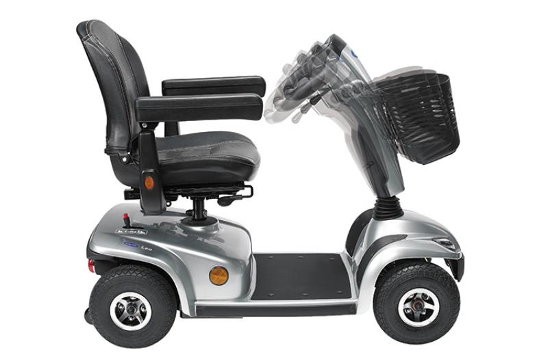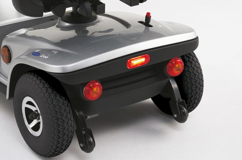 Mit hellen Scheinwerfern und Bremslichtern sorgt das Elektro Mobil Invacare Leo auch im Dunkeln für sichere Fahrten. Durch die stufenlos einstellbare Lenksäule wird eine ergonomische Sitzhaltung möglich. Der drehbare Sitz vereinfacht zudem das Ein- und Aussteigen. Für ein Maximum an Sicherheit.